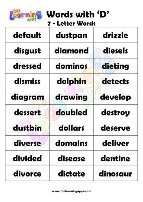 Web some common examples include dog, door, desk, day, dinner, dark, dream, dance, and doctor. Matches entered letters in any sequence anywhere in the word. Containing the letters (in any position). See the full list here! Web 7 letter words starting with d. Scrabble word helpers if that's what you're looking for. Check our scrabble word finder, wordle solver, words with friends cheat dictionary, and wordhub word solver to find words starting. Win with a list of d words that are 7 letters long in scrabble, words with friends and more. Web find all 7 letter words starting with d. Starts with (optional) in the middle (optional) ends. Dabster, dackers, dacoits, dacoity, dactyli, dactyls, daemons, daglock.