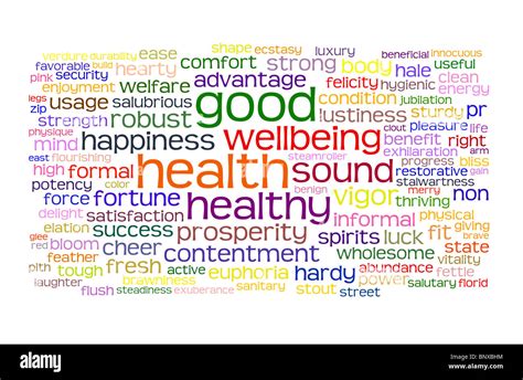 Health and wellbeing related text word cloud on white background Stock